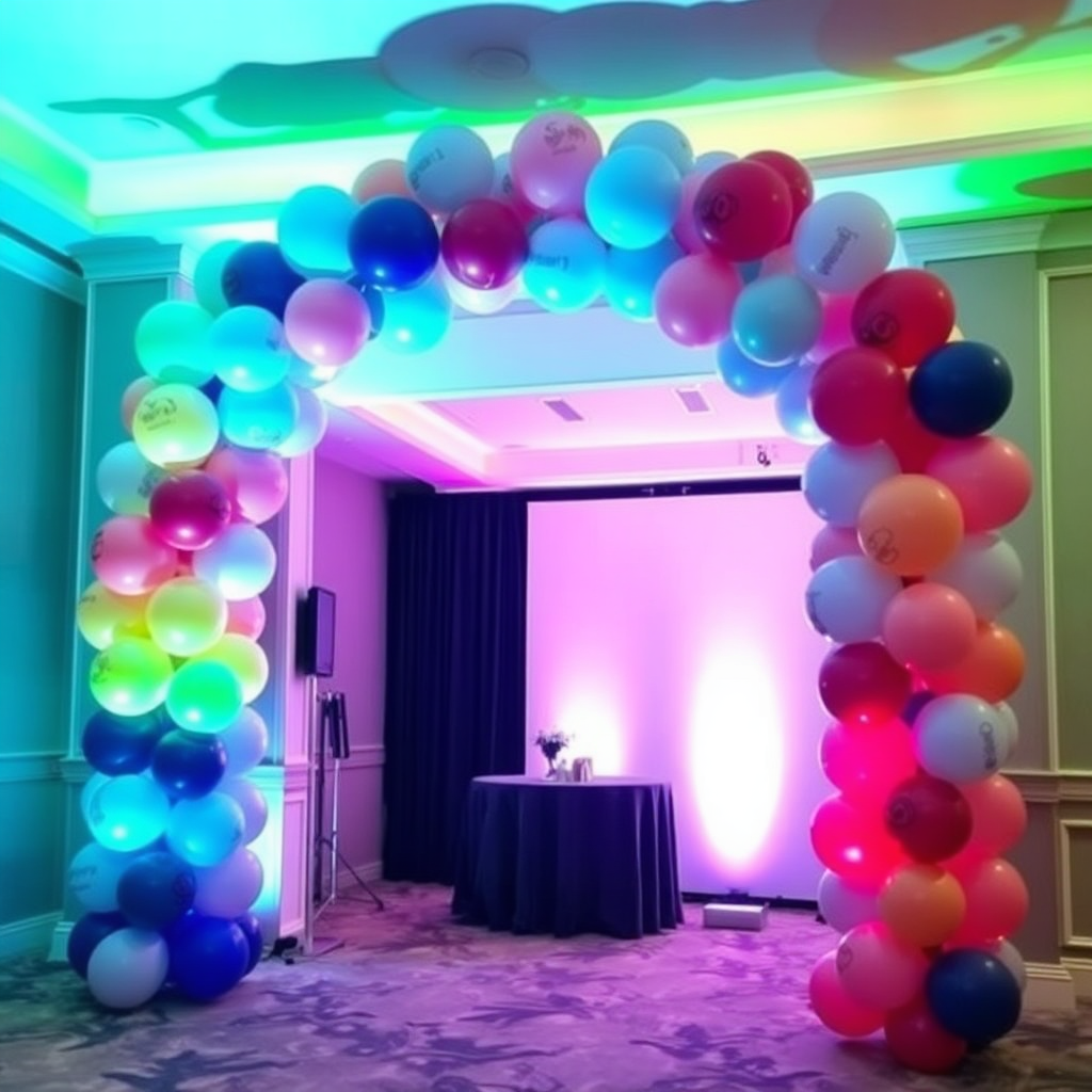 An immersive scene depicting a magical themed event, showcasing a fantastic balloon archway leading into an enchanted garden party. The composition is colorful, filled with a variety of balloon shapes, blending seamlessly with floral arrangements and themed decorations. The lighting is vibrant, enhancing the playful atmosphere. The camera angle is from an inviting perspective, enticing viewers to step into this magical experience, defined by creativity and thematic cohesion.